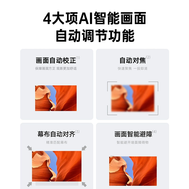 采用新一代2.0T渦輪光機(jī)封閉式防塵高亮,4環(huán)光學(xué)鍍膜鏡頭久用不虛焦高透光高清晰,4大項(xiàng)AI智能畫面自動調(diào)節(jié) 自動校正;自動對焦;自動避障;自動入幕,讓用戶在使用過程中更加省心省力。